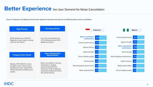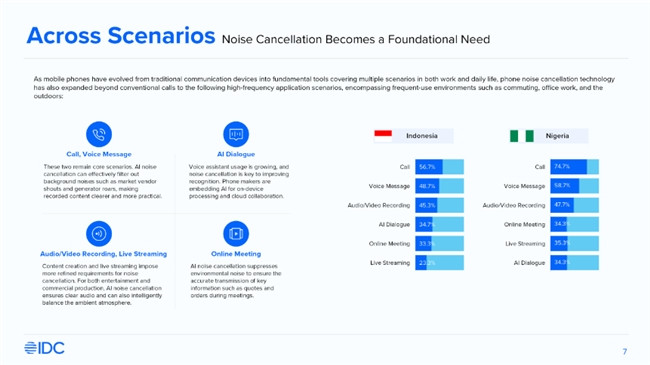 IDC调研透露,在印度尼西亚和尼日利亚,分袂有65.6%和69.3%的用户敌手机降噪功能存在犀利需求,约三分之一用户在选购手机时将降噪才调视为进击考量身分。同期,由于当地蓝牙耳机普及率较低,手机端内置降噪才调成为提高通话体验的要道处分决策。