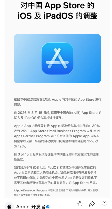 寰宇苦“苹果税”久矣。3月13日,苹果公司通知对中国内地的APP圭臬佣金率将由当今的30%改为25%,中小设立者以及自动续费订阅佣金率将由当今的15%进一步降至12%。