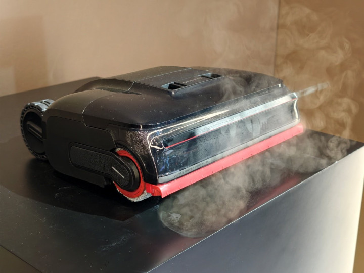 傍边的H70UltraStation演示的是另一项“外挂”才智。职责主说念主员在地板上挤了一摊老抽酱油,晾了转眼让它半干,然后开动洗地机——滚刷刚斗争大地,一股白色蒸汽霎时喷出,污渍确凿是看着被冲走。