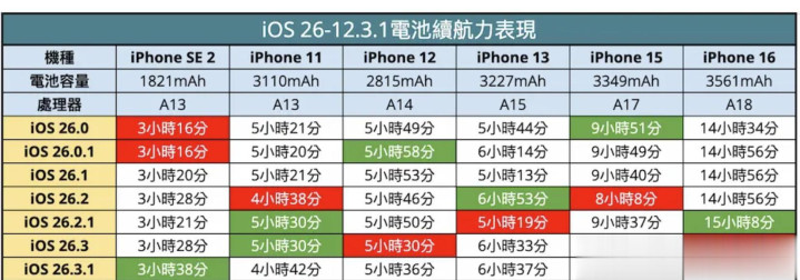聚首国外续航实测与多数用户响应数据来看,iOS 26.3.1 的续航进展并莫得出现“全面提高”,而是呈现出赫然的机型互异。