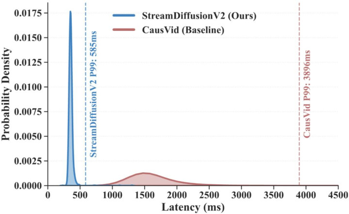 图 9 上图:第一帧本领对比,体现了 StreamDiffusionV2 的低延迟上风;下图:系统端到端延迟统计散布图,StreamDiffusionV2 有着精良散布,低抖动,并达到亚秒级及时应用条目。