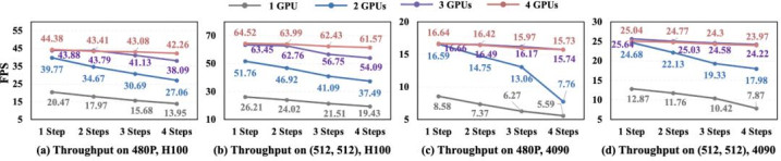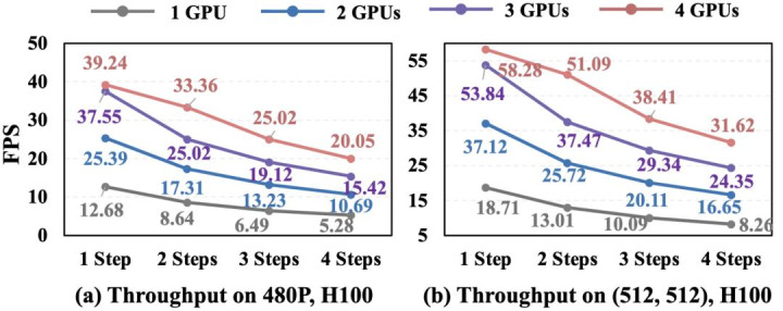 StreamDiffusionV2 已全面开源,对个东谈主用户部署友好,在未应用 TensorRT 或量化的情况下,好像在仅配备双卡 RTX 4090 的建造上踏实 16 FPS 及时推理。其在 H100 上首帧延迟低于 0.5 秒,并在 4 卡建造上踏实收场 14B 模子 58.28 FPS、1.3B 模子 64.52 FPS 的蒙眬量。