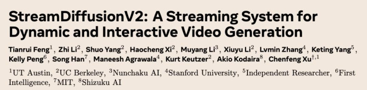 近日,一项依然被筹算机系统顶级会议 MLSys 2026 禁受的使命 StreamDiffusionV2,对这一问题进行了详确策动并给出了处理决议。来自德克萨斯大学奥斯汀分校等机构的磋商者构成的团队提倡了一种无需历练、面向交互式直播的流式视频生成系统。该系统可在多种类型 GPU 上踏实启动,同期收场低延迟与高质地生成。