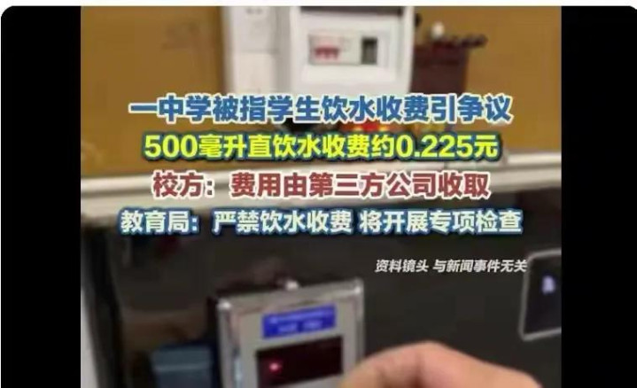 涉事学校此前使用传统沸水桶给水,因卫生不达标被停用。为保险学生饮水安全,学校引入第三方清水公司,在训诫楼、寝室区布设直饮水缔造,实行充值刷卡计费,500毫升收费0.225元,折算1升0.45元。校方暗意,收费仅为回收缔造、耗材、水电及检测本钱,未强制学生使用,学生可自备饮用水。