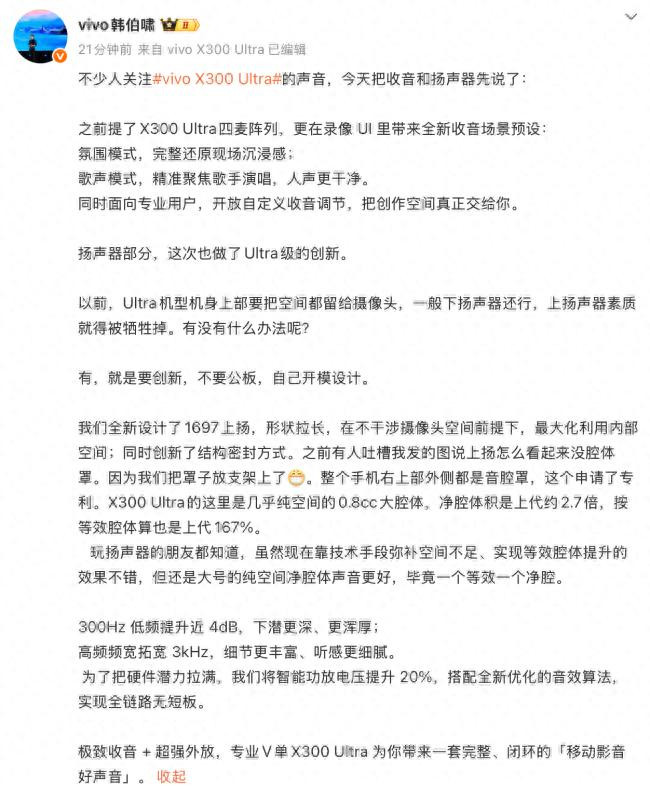 【iMobile爱科技资讯】3月13日,vivo 居品司理韩伯啸对新一代影像旗舰 vivo X300 Ultra 的音频系统进行了详备解读。比拟以往Ultra机型更侧重影像材干的建联想路,这一代居品在扬声器结构与收音系统上也进行了针对性升级,试图在影像创作以外补皆迁移影音体验。